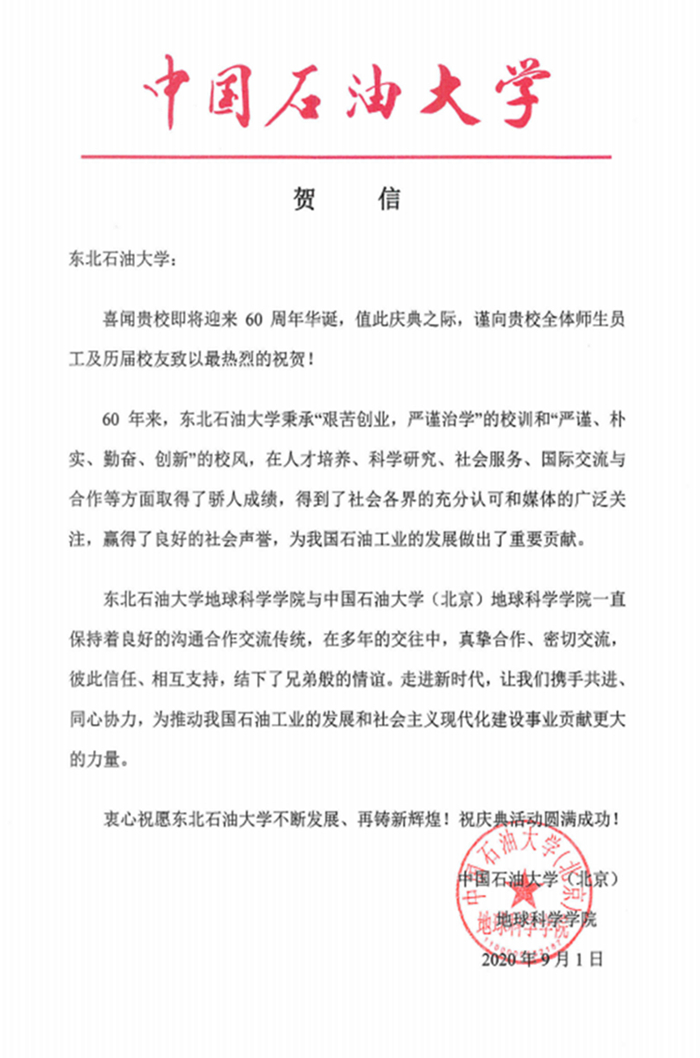 中国石油大学(北京)地球科学学院向我校发来贺信