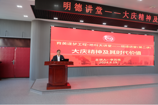1964年4月19日,新华社播发了长篇通讯《大庆精神大庆人》,首次提出了“大庆精神”的概念。为庆祝“大庆精神”提出60周年,黑龙江省高校人文社会科学重点研究基地、黑龙江省哲学社会科学研究大庆精神基地、美加墨世界杯官方网站大庆精神教育研究中心主任李万鹰受邀做客世界杯官网育英逐梦工程·地科大讲堂之明德讲堂,为广大师生作题为《大庆精神及其时代价值》的专题讲座。校党委副书记高洪峰、党委常委宣传部部长徐清亮、地球科学学院师生、学校党外知识分子、民主党派、无党派人士以及部分机关职能部门负责人参加本次讲座。讲座在1H211会议室举行,由地球科学学院党委书记韦丹宁主持。