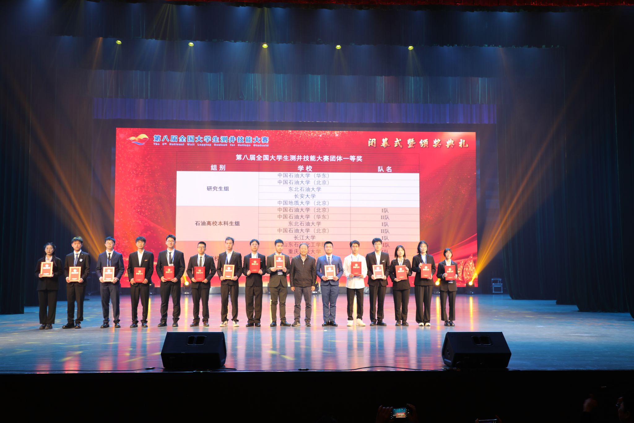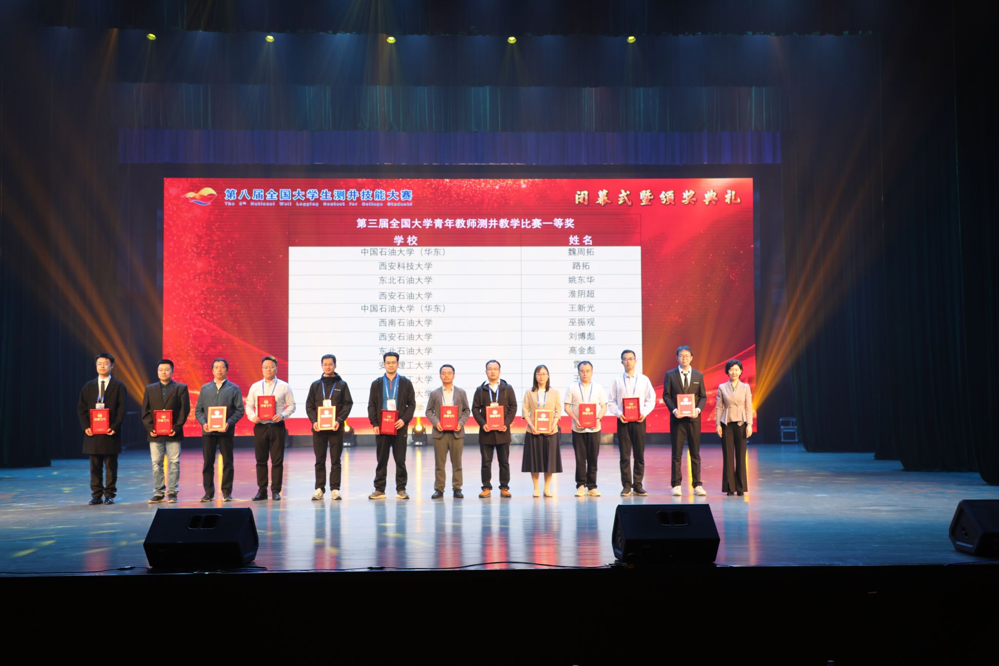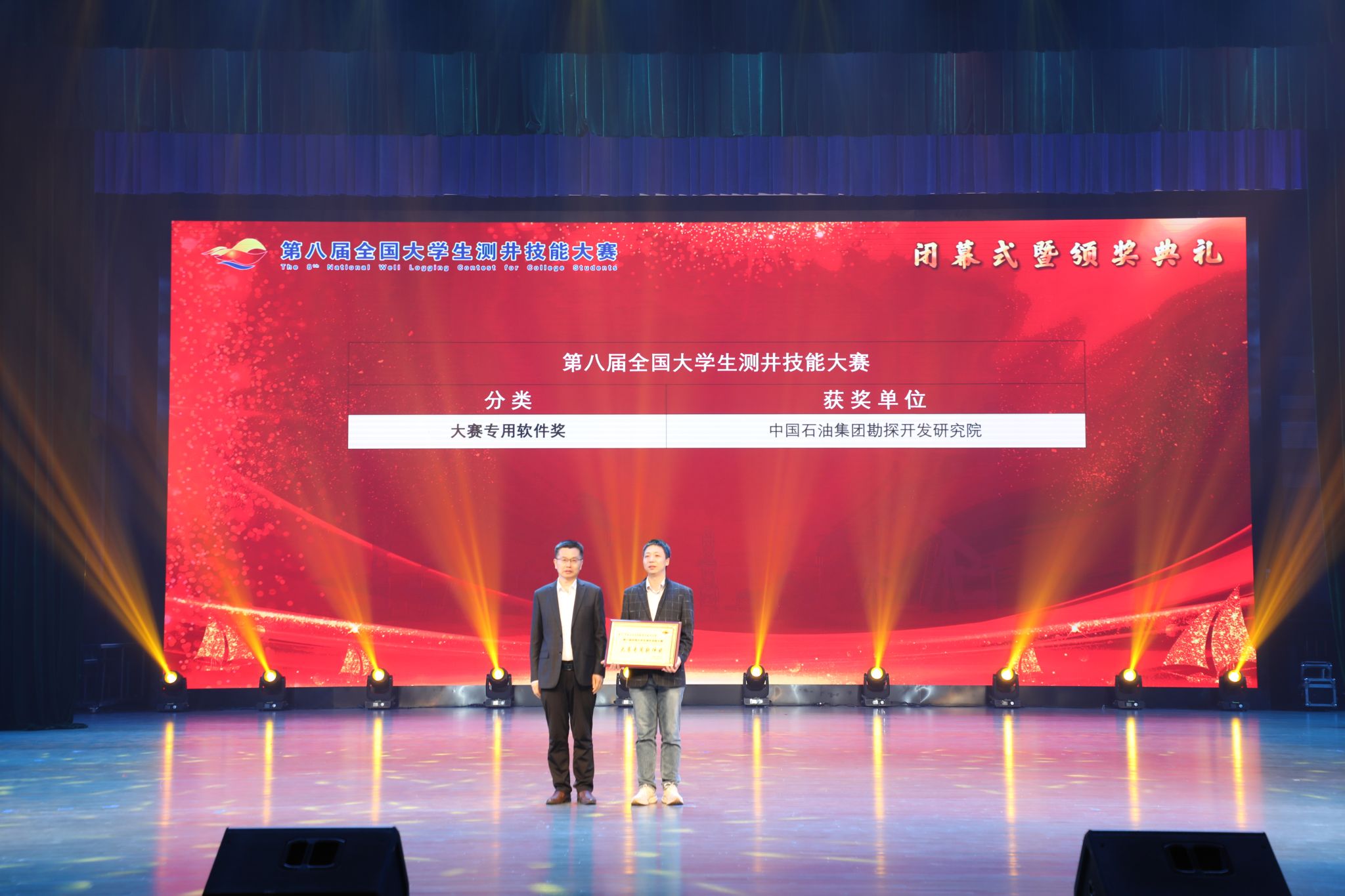 与会领导为第八届全国大学生测井技能大赛、第三届全国大学青年教师测井教学比赛获奖者颁奖。