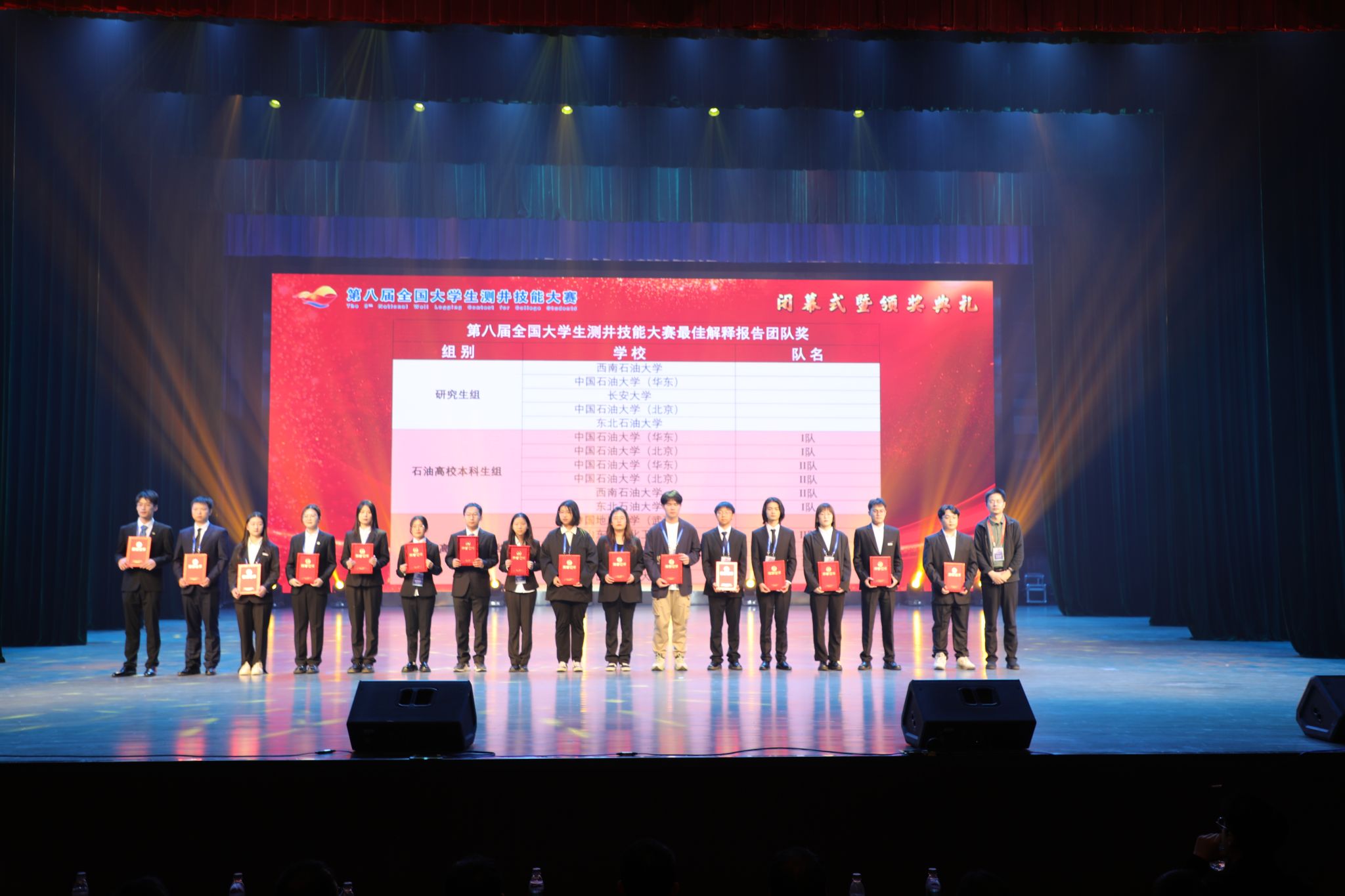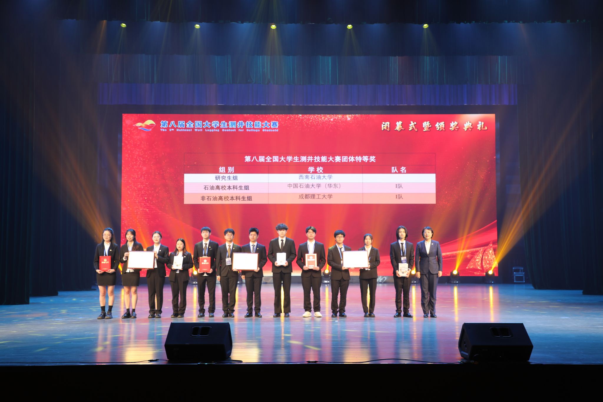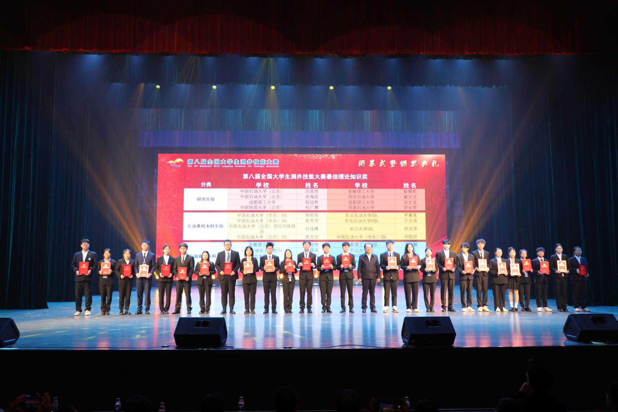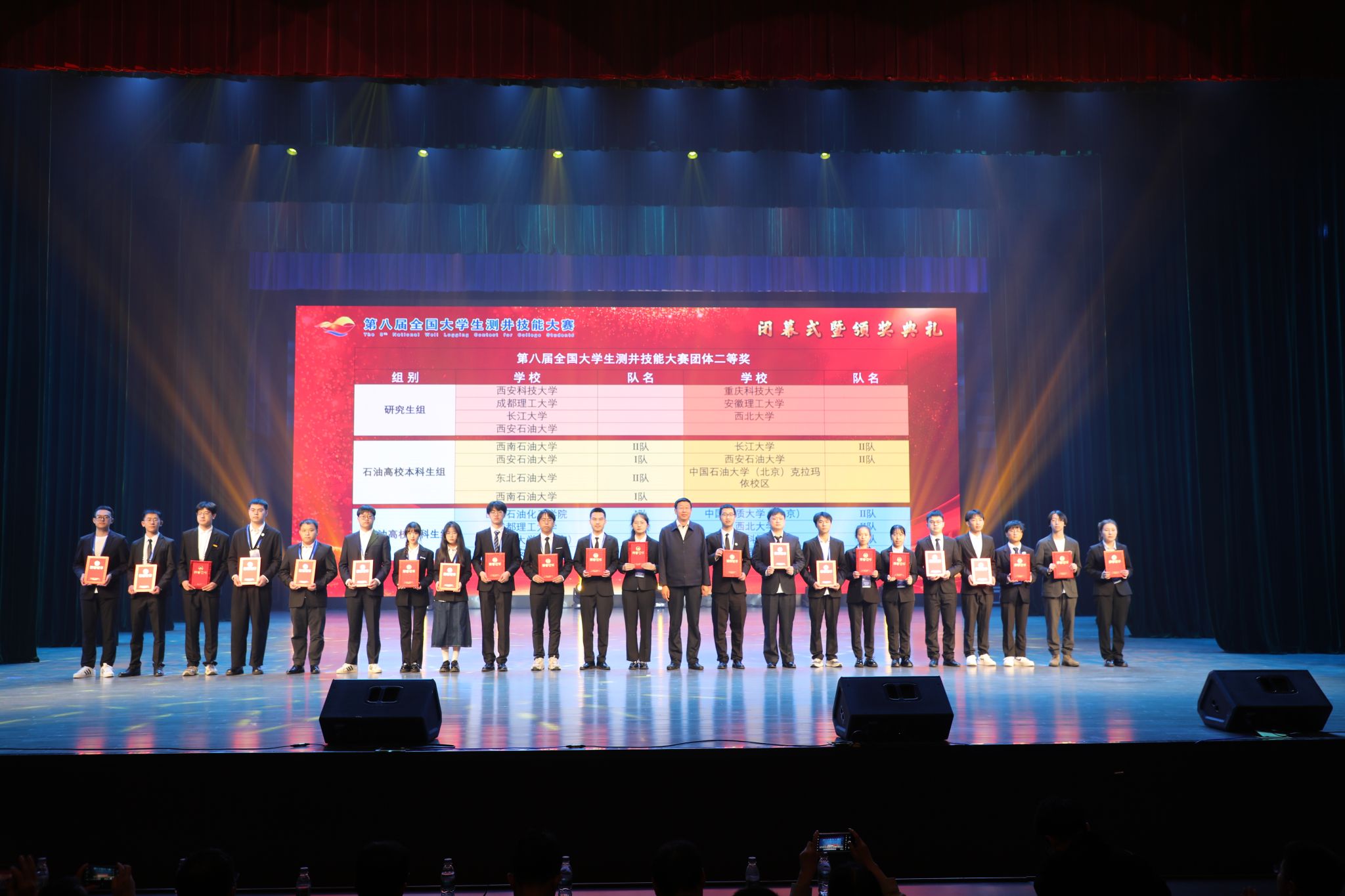 与会领导为第八届全国大学生测井技能大赛、第三届全国大学青年教师测井教学比赛获奖者颁奖。