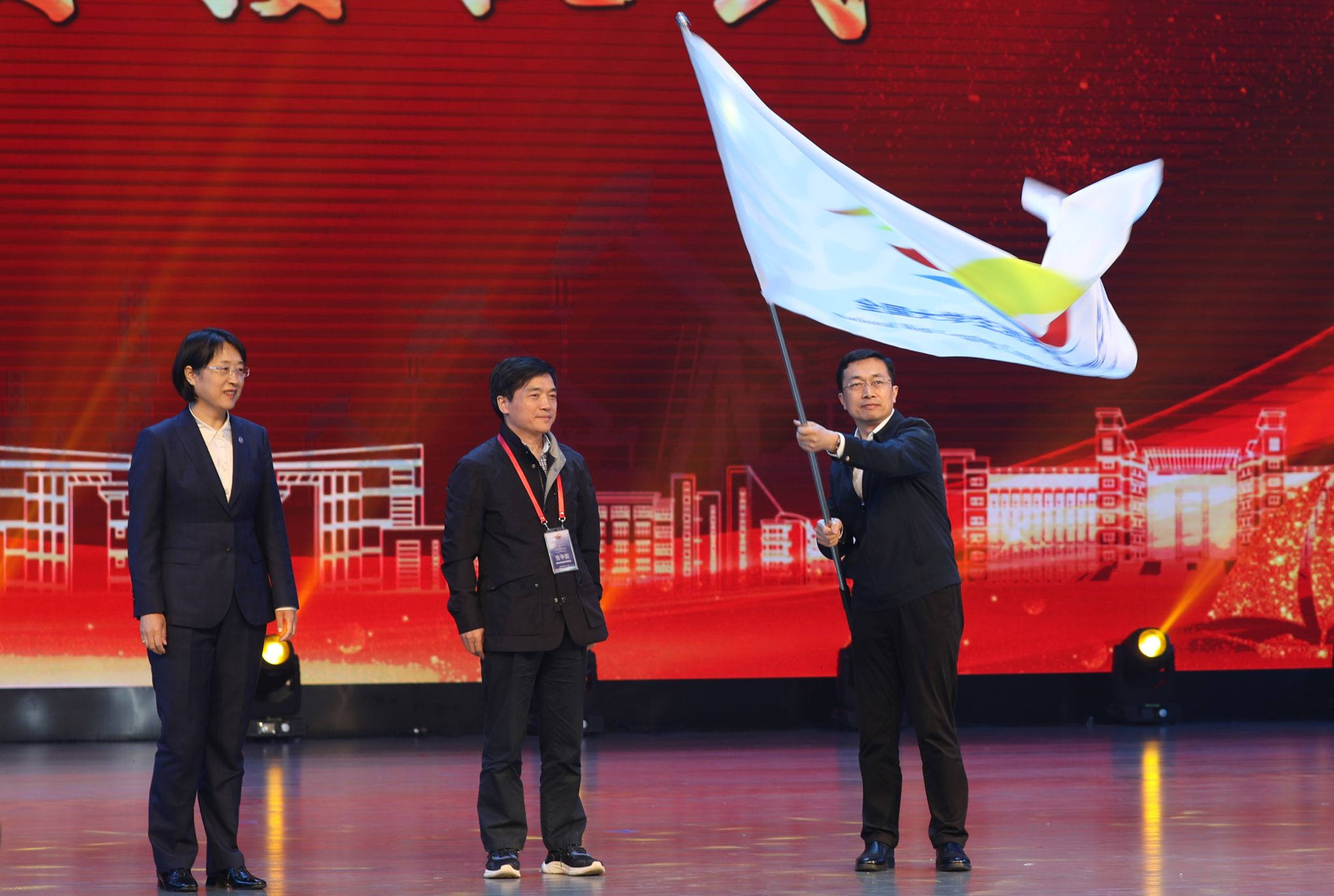 张辛耘、石颖、张荣新共同完成大赛赛旗交接仪式。