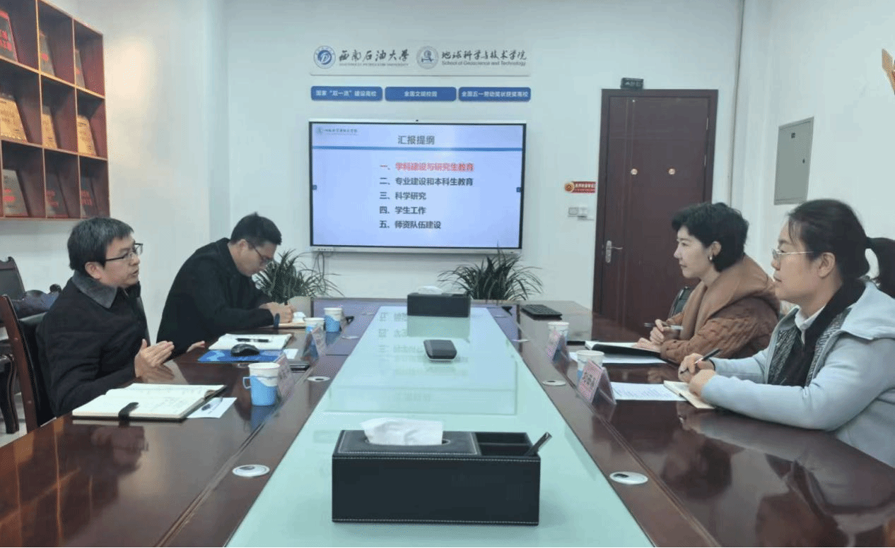 在与西南石油大学地球科学与技术学院党委书记赵晓明、党委副书记张勇的交流中,韦丹宁和赵晓明分别介绍了学院党建工作、学科建设、专业建设和师资队伍建设等基本情况,就共同关注的党建工作与业务工作融合、人才培养、学生创新能力培养和学院文化建设等进行了深入交流。双方表示将进一步加强协同创新、密切日常联系,持续深化人才培养等方面交流合作。座谈结束后,韦丹宁一行参观了校友长廊、院史墙、党建和能源文化阵地、大学生创客空间和地质展厅。
