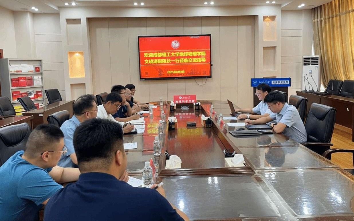 8月8日下午,成都理工大学地球物理学院副院长文晓涛一行到世界杯官网走访调研。副院长王海学、吴海光,勘技系主任王宁,勘技系教授王维红、刘淑芬等参加座谈。王海学主持会议。