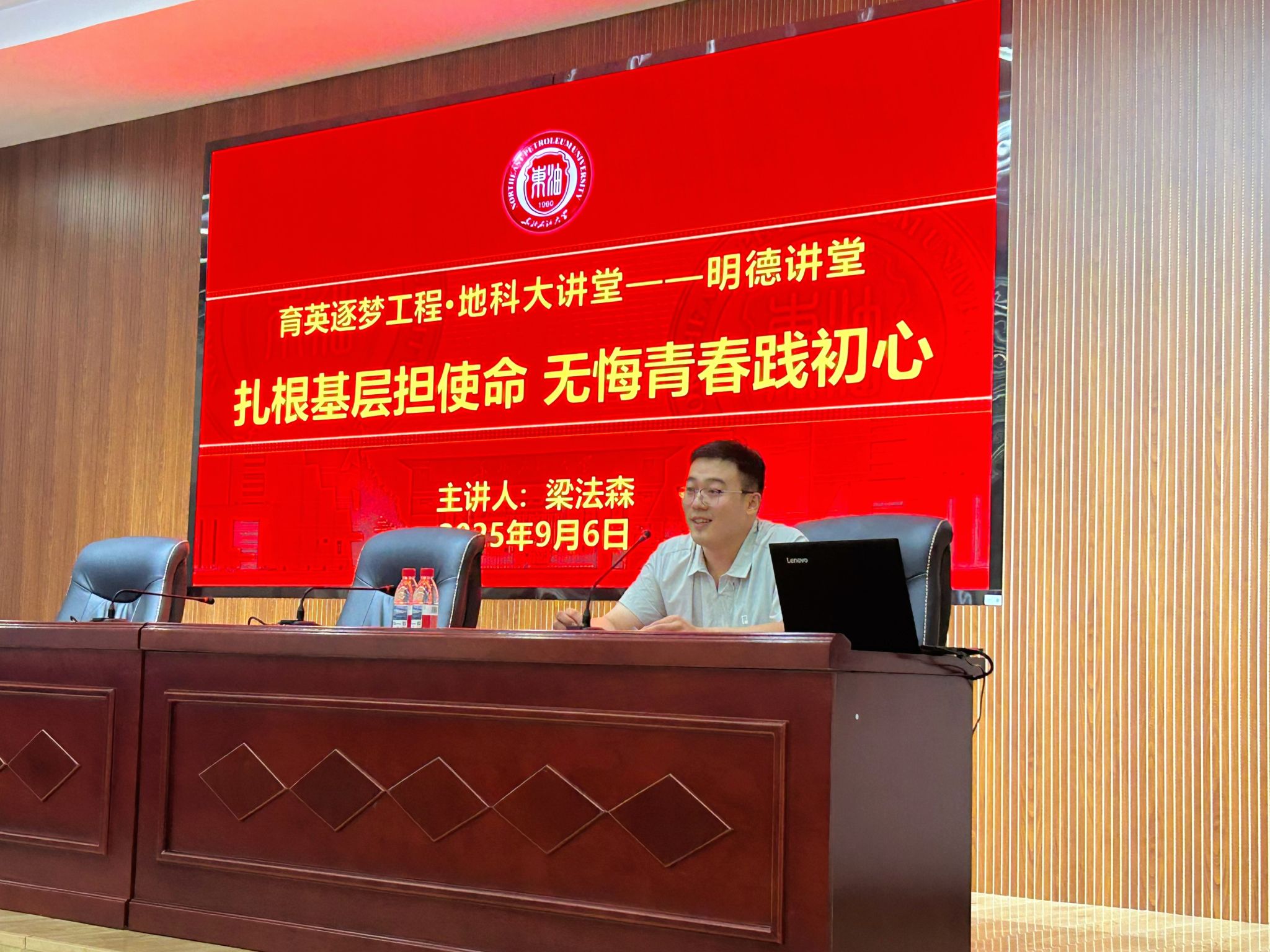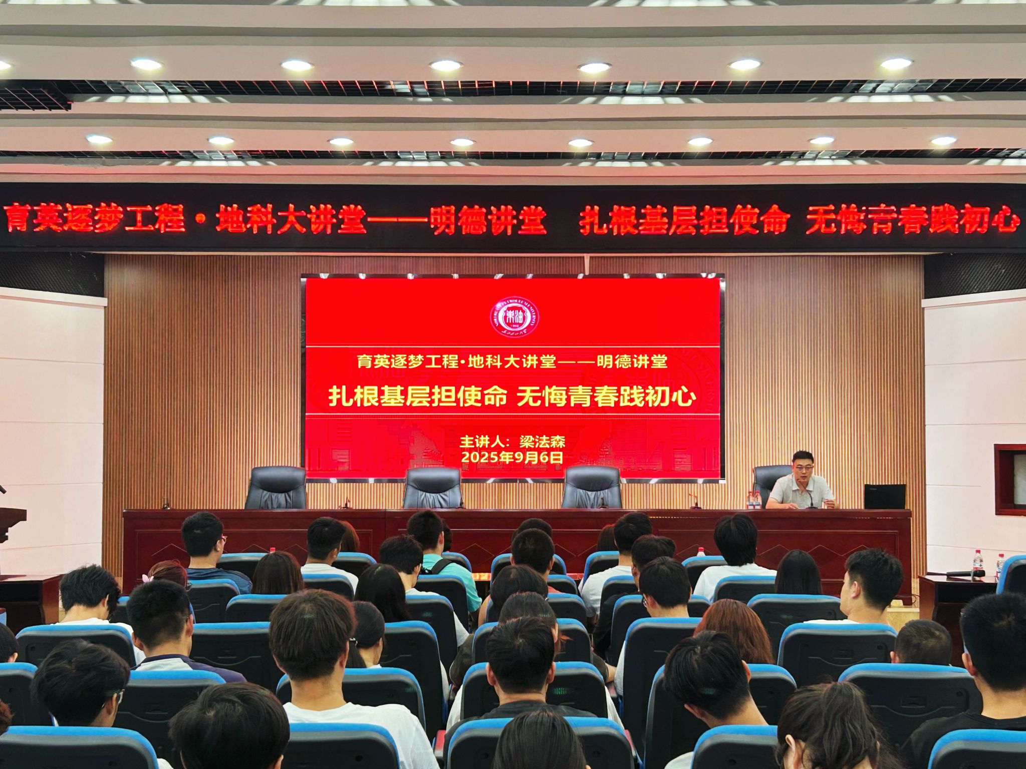 为激励学生树立远大理想、将个人发展融入国家需求,9月6日,学院特邀勘查技术与工程专业2017届优秀校友、全国基层就业卓越奖学金获得者梁法森作客地科大讲堂,为师生带来一场题为“扎根基层担使命 无悔青春践初心”的专题报告。学院党委书记韦丹宁、全体辅导员及学生代表参加了本次活动。讲座由2026届毕业班辅导员李海悦主持。