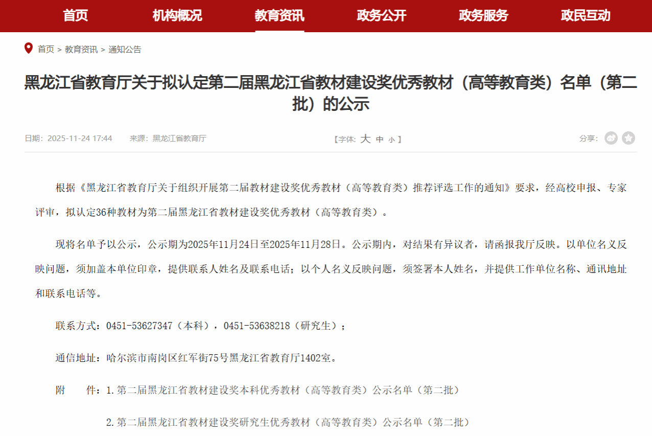近日,黑龙江省教育厅发布了《关于拟认定第二届黑龙江省教材建设奖优秀教材(高等教育类)名单(第二批)的公示》,经各高校申报、专家严格评审,共评选出36部获奖教材,我院刘吉余教授主编的《油气田开发地质基础(第五版·富媒体)》获省级本科优秀教材一等奖。