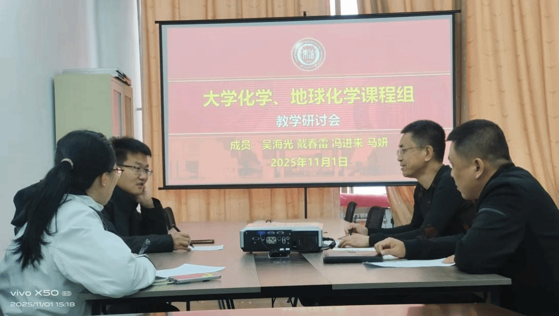 2025年11月1日,《大学化学》和《地球化学》课程教学团队在地科馆813开展了教学研讨活动。课程组成员吴海光、戴春雷、冯进来、马妍参加,会议由吴海光主持。