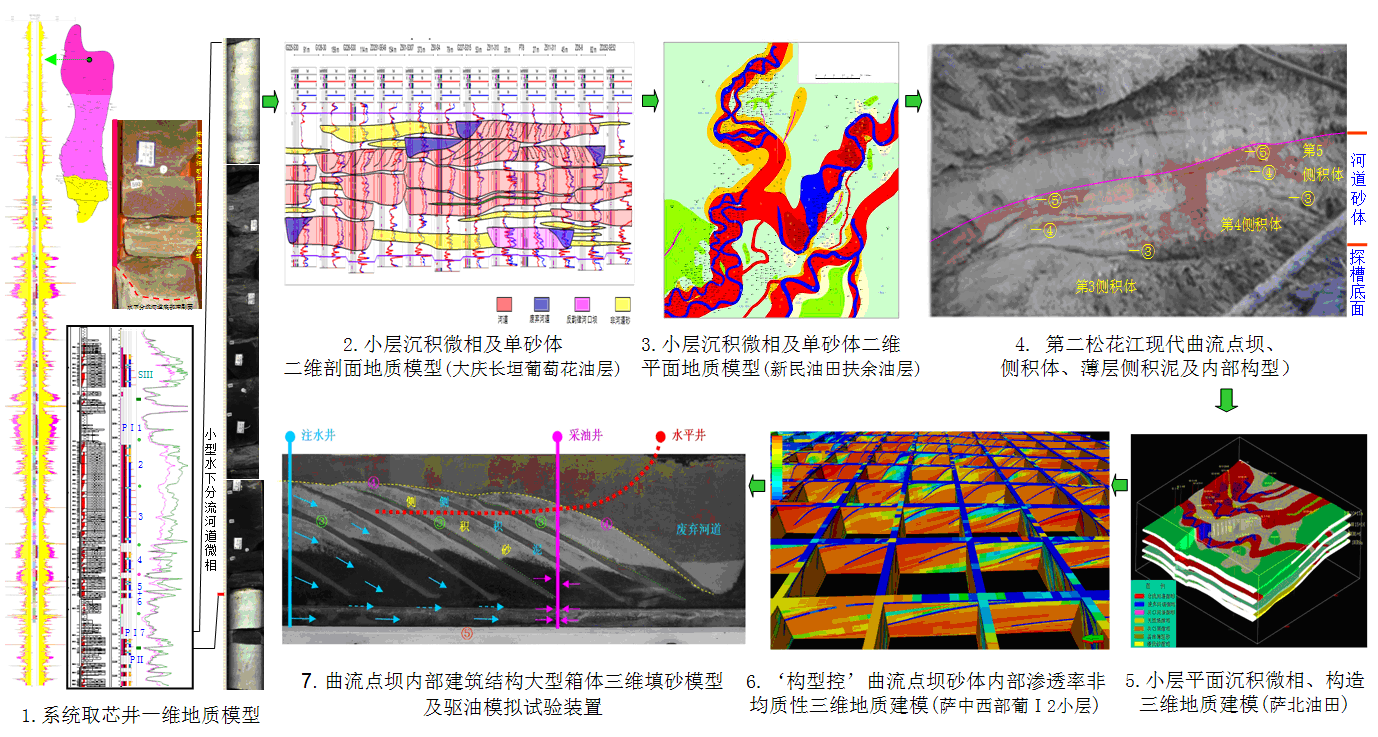 形成了七项“核心技术”:(1)高分辨率层序划分与一致性对比技术;(2)超短期旋回层序平面沉积微相综合分析技术;(2)井震单砂体综合识别技术;(3)微相控储层非均质性、流动单元刻画技术;(4)储层三维地质建模及非均质性等效表征技术;(5)储层内部构型综合分析技术;(6)储层构型大型箱体填砂模型、人造岩心及驱油模拟试验技术;(7)储层构型控剩余油综合分析技术。