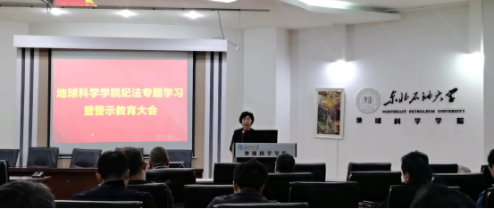 为深入贯彻落实二十届中纪委三次全会、省纪委三次全会和学校党委一届九次全委(扩大)会议精神,落实文件《关于在全校开展党纪学习教育的实施方案》的部署要求,引导全体党员干部学纪、知纪、明纪、守纪。4月24日下午,地球科学学院召开纪法教育专题学习暨警示教育大会,会议由学院党委书记韦丹宁主持,地球科学学院全体教师参加。