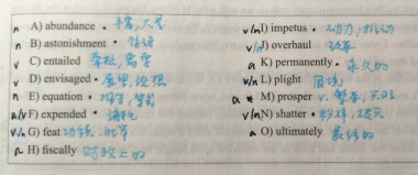 单词积累除了日常背词汇书外,还可以在做题过程中积累。以选词填空为例,这是一项与积累量有很大关系的题型,对照答案修改后,要查明自己不会的词,进行总结同词性词,同义词等,日后再在文段中遇到时,做到联系上下文结合印象也能推断出大致词意。