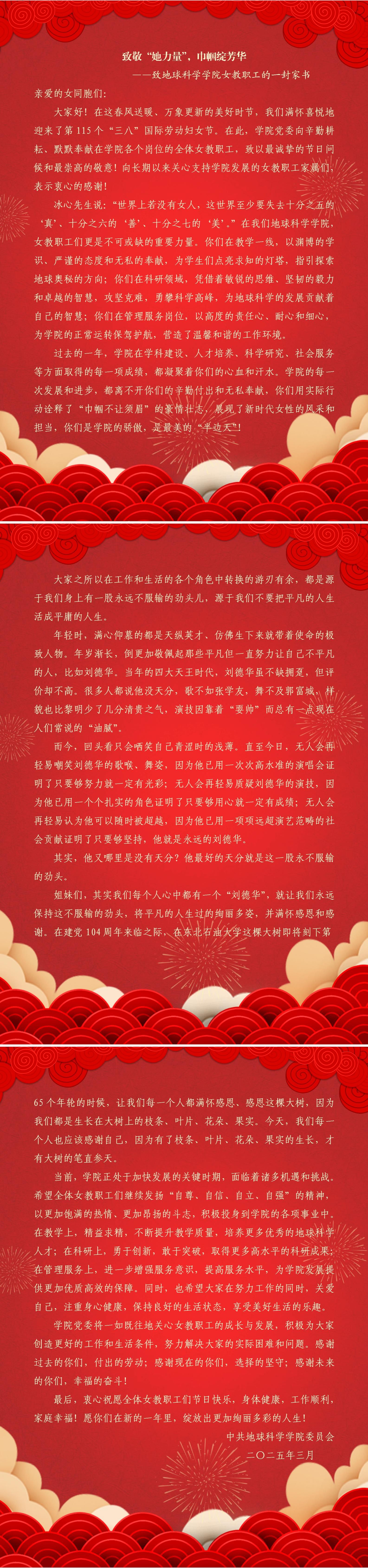 致敬“她力量”,巾帼绽芳华——致地球科学学院女教职工的一封家书