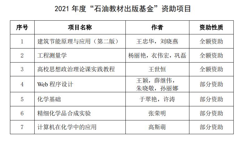 日前,石油工业出版社公布了《关于公布2021年度“石油教材出版基金”资助美加墨世界杯官方网站项目的通知》。经学院组织申报、教务处择优推荐、石油教材出版基金管理办公室组织专家评审等环节,我校共7部教材入选2021年度“石油教材出版基金”资助项目,世界杯官网杨丽艳、衣伟宏、巩磊主编的《工程测量学》入选全额资助类。
